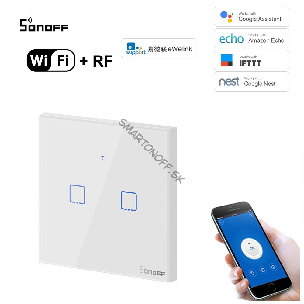 Sonoff TX0 - 2ch: WiFi EU - je Wi-Fi inteligentný vypínač v luxusnom prevedení, ktorým môžete ovládať svetlá alebo iné elektrické zariadenia hneď niekoľkými spôsobmi nezávisle na sebe a zmena stavu vypínača sa prepíše do všetkých aplikácií, ktoré ho ovládajú. Dotykový vypínač Sonoff TX0 je možné ovládať priamo dotykom, alebo aplikácií v mobilnom telefóne (iOS aj Android), dalšou možnostou je ovládanie hlasom za pomoci Google Home, Google Assistant, Amazon Alexa, IFTTT a podobných služieb, alebo napríklad inými vypínačmi z produktovej rady Sonoff (za pomoci nastavenia Chytrých scén).