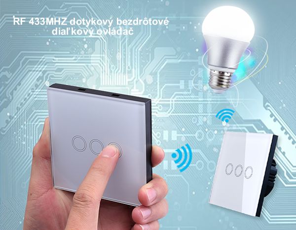 Inteligentý vypínač s podoprou RF zapojíte namiesto existujúceho vypínača a na iné vhodné miesto prilepíte na stenu dotykový bezdrôtový RF vypínač VH1G a nemusíte sekat a tahať žiadne káble.