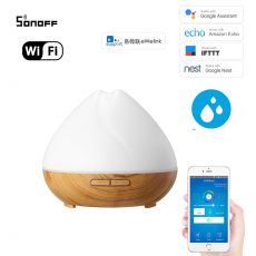 Wifi inteligentný ultrazvukový aróma difuzér - pomocou ultrazvuku vytvára jemnú paru, LED osvetlenie so siedmimi farbami,  stupne časovača, objem: 400ml, prevedenie tmavé drevo. Ovládanie je možné priamo spínačom, alebo pomocou aplikácie v mobilnom telefóne (iOS aj Android), dalšou možnostou je ovládanie hlasom za pomoci Google Home, Google Assistant, Amazon Alexa, IFTTT a podobných služieb, alebo napríklad inými spínačmi z produktovej rady Sonoff (za pomoci nastavenia Chytrých scén).