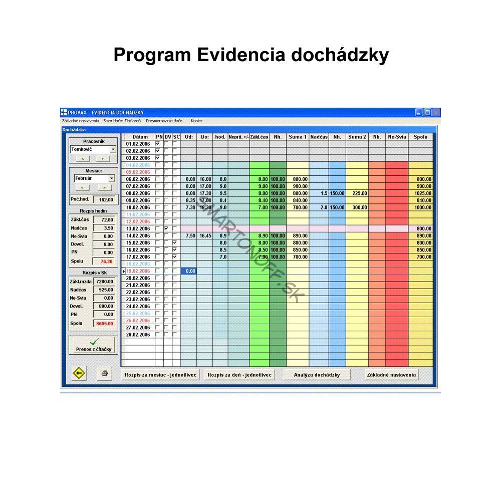 Program Evidencia dochádzky- Tento program je samostatným systémom určeným na sledovanie dochádzky zamestnancov firmy. Systém je prepojený na čítačku bezkontaktných kariet, ktorá registruje príchody a odchody zamestnancov. Program poskytuje veľmi prehľadné informácie o každom zamestnancovi, dátumoch a časoch príchodu do práce a odchodu z pracoviska.